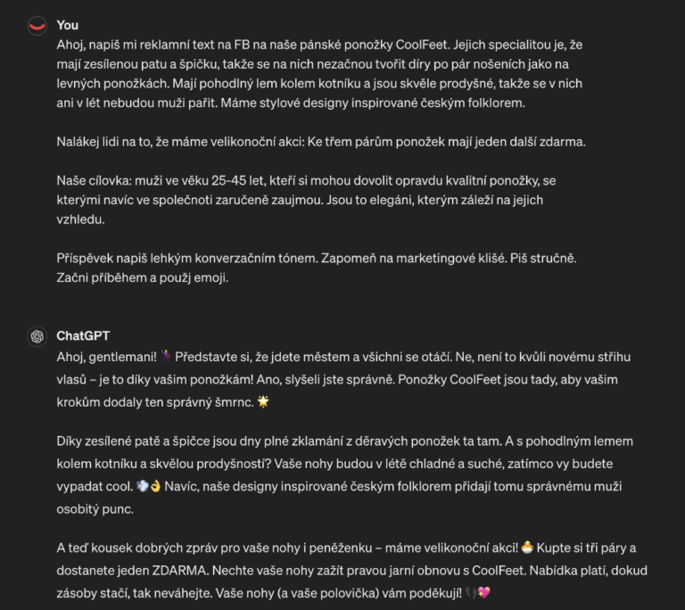 - Na hraní rolí: AI může předstírat, že je váš zákazník. Díky tomu vám může nasimulovat, co ho trápí nebo jaké texty by si chtěl přečíst.